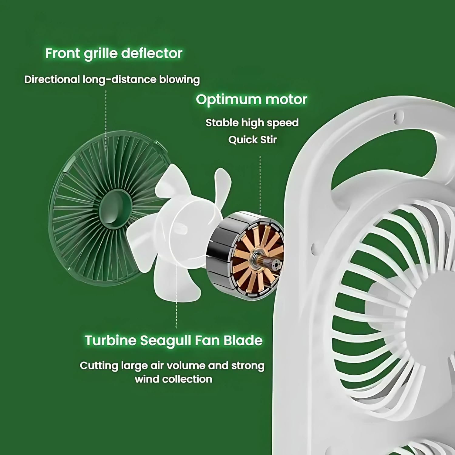"Style Minimalist Colour Green Electric fan design Table Fan Power Source Battery Powered Product Dimensions 12D x 8W x 36H Centimeters Special Feature Triple Turbine Blade Design, USB Charging, Ultra-Quiet Operation Material Plastic Number of Speeds 3 Finish Type Painted"
