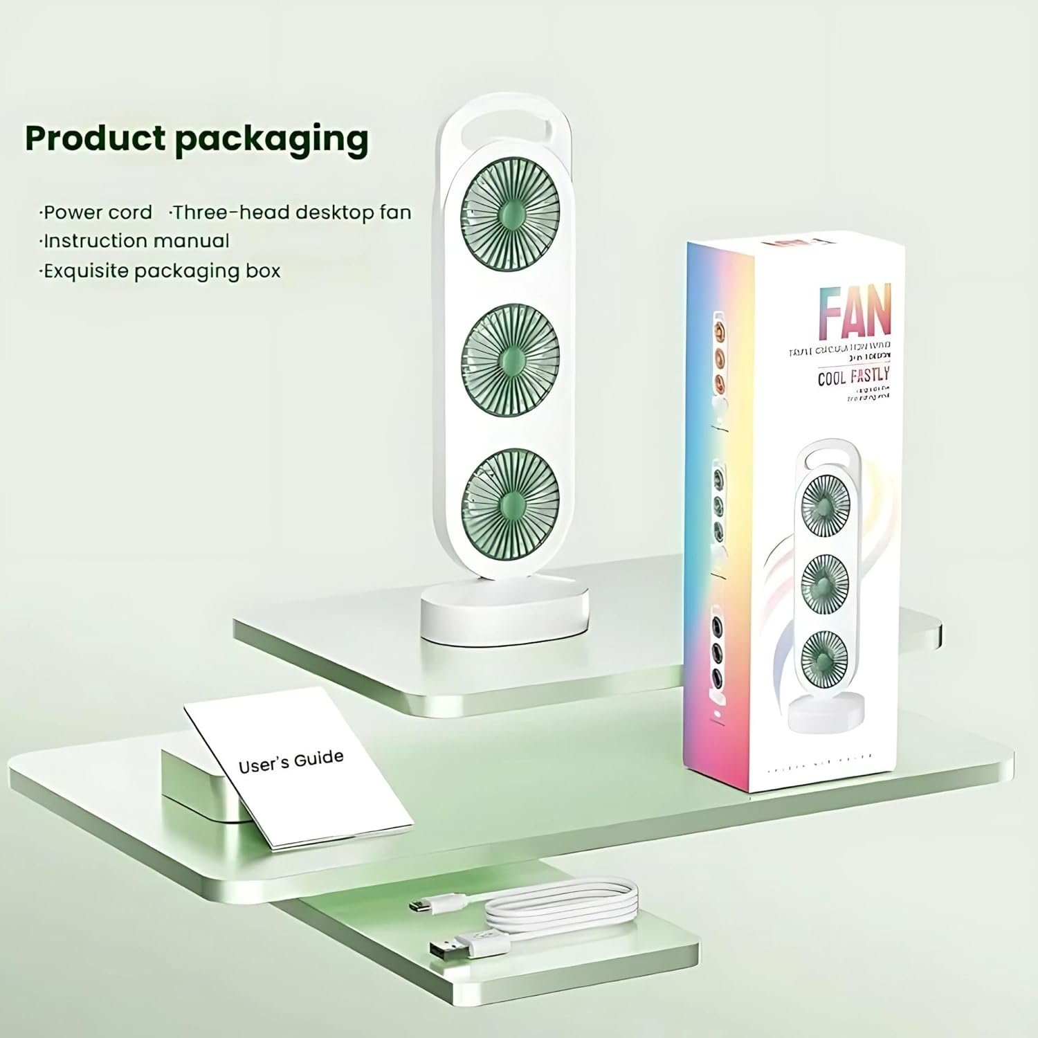 "Style Minimalist Colour Green Electric fan design Table Fan Power Source Battery Powered Product Dimensions 12D x 8W x 36H Centimeters Special Feature Triple Turbine Blade Design, USB Charging, Ultra-Quiet Operation Material Plastic Number of Speeds 3 Finish Type Painted"